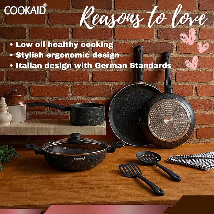 • Versatile & Multi-Functional – Cook everything from crispy dosas, fluffy omelets, and grilled sandwiches to deep-fried snacks and rich curries – all in one durable cookware set.