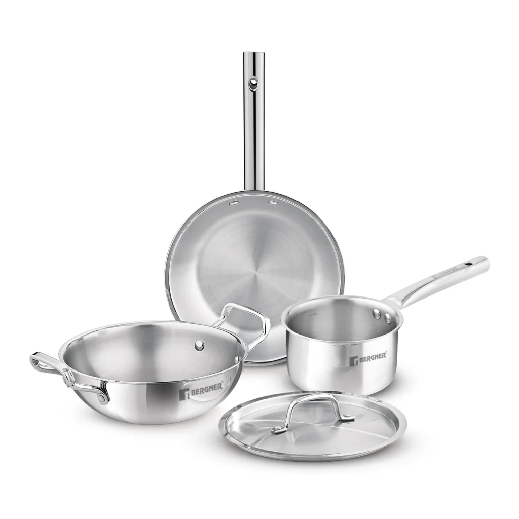 The Bergner TriPro Tri-Ply Stainless Steel 4 Pcs Cookware Set is a premium choice for home cooks looking for quality performance and everyday versatility. Crafted with advanced triply stainless steel construction, this set is considered a top cookware set for modern kitchens that value even heat distribution, durability, and healthy cooking.